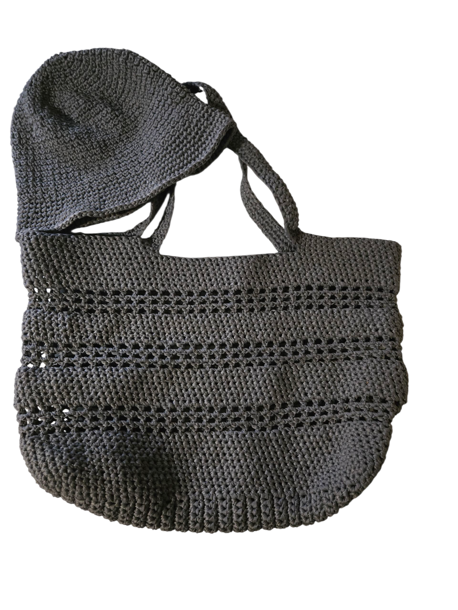 Handmade crocheted bucket hat and bag combo made with polyester yarn. In a dark gray colorway.one size fits most for the hat. Bag is approximately 17.5 x 12.