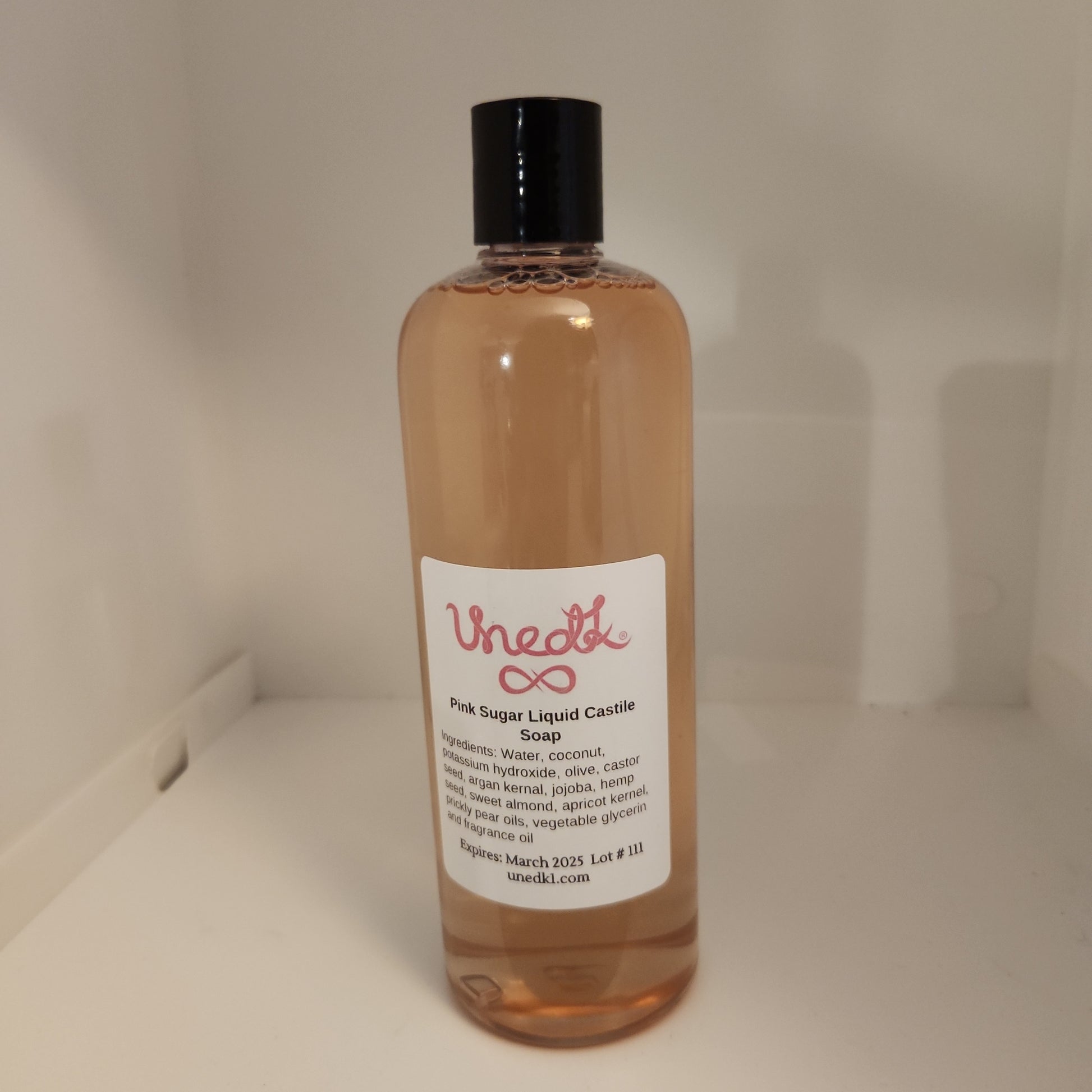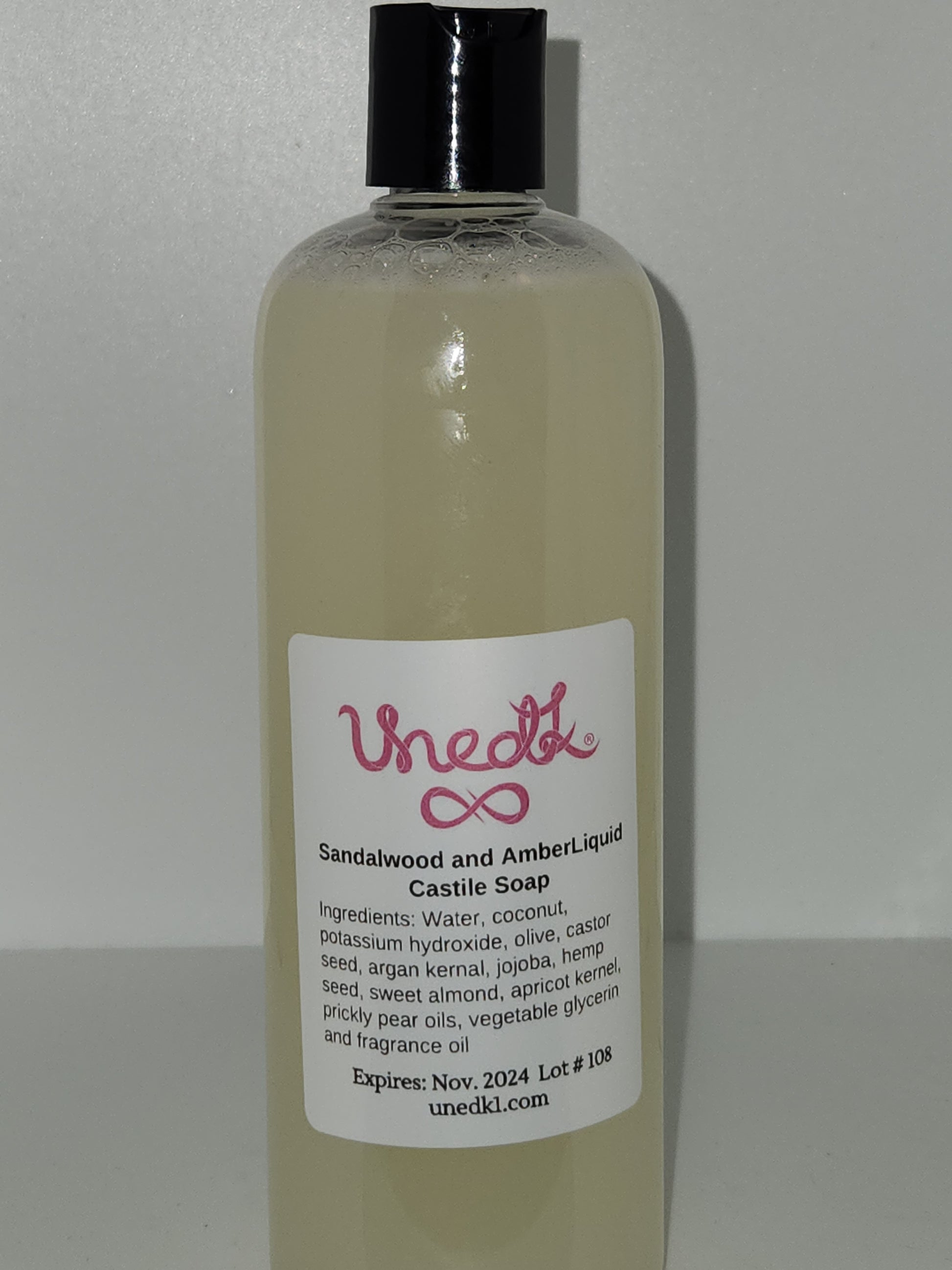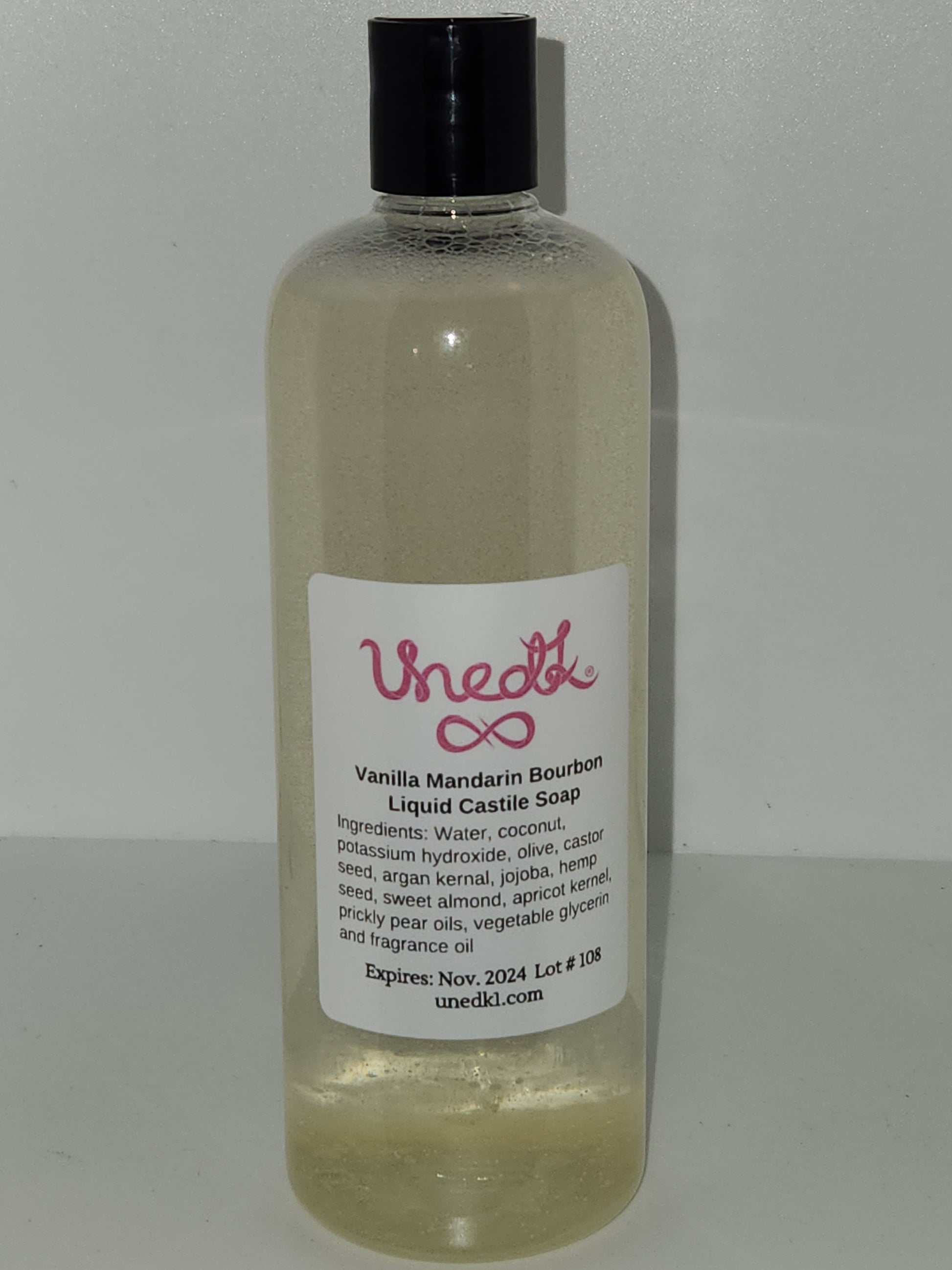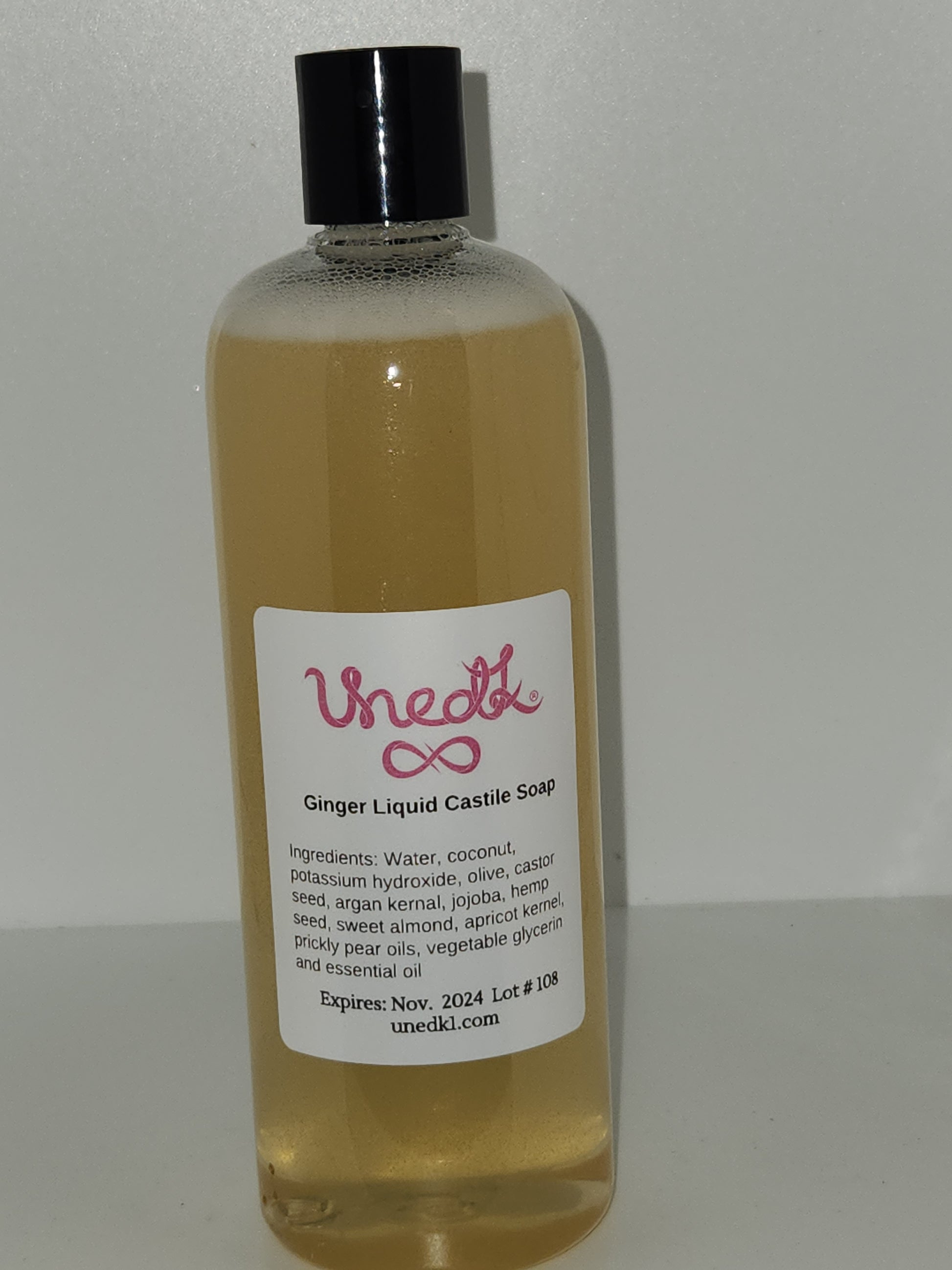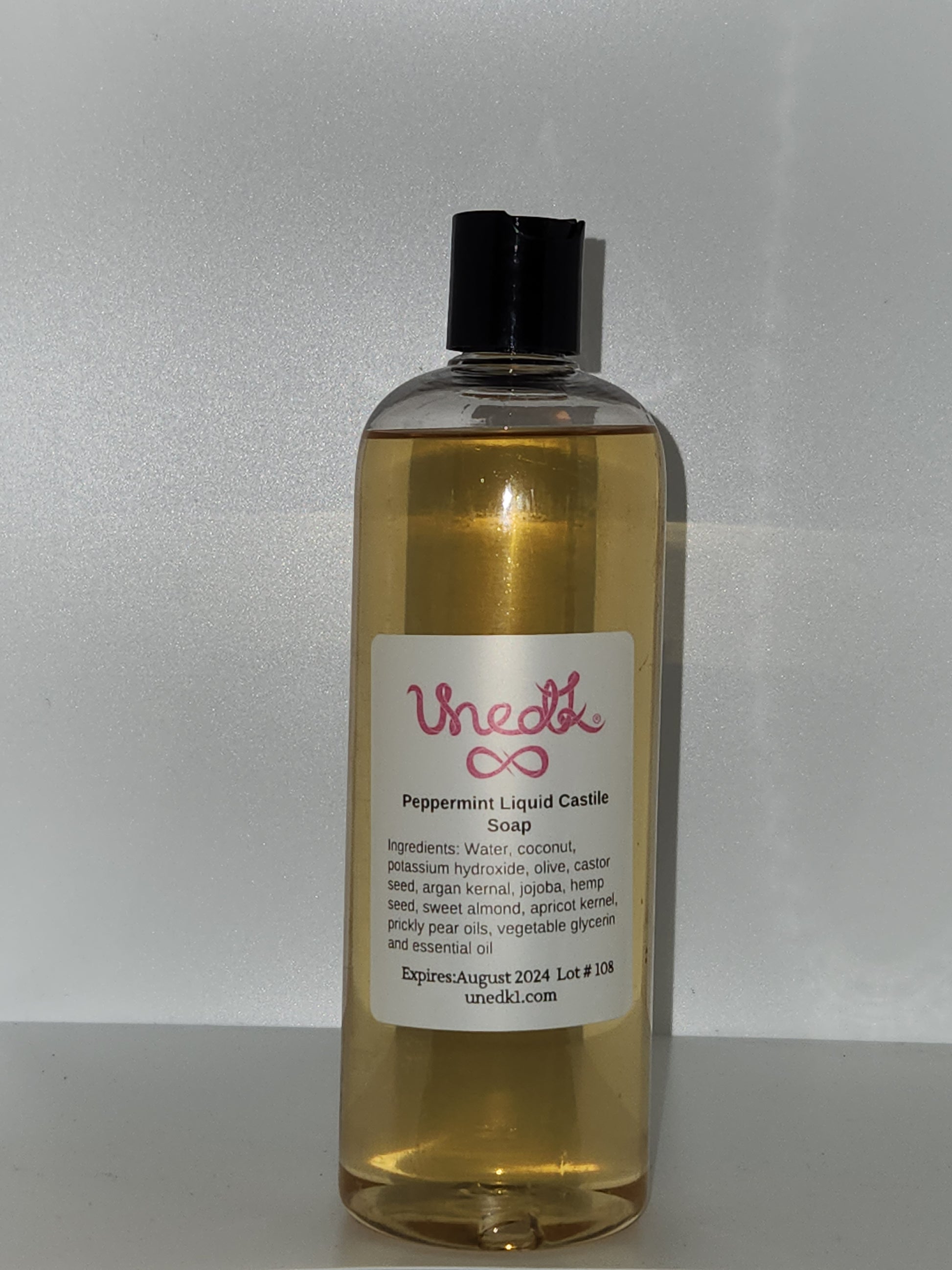 Handmade liquid castile soap. Ingredients: water, coconut oil, potassium hydroxide, olive oil, castor seed oil, argan kernel oil, jojoba oil, hemp seed oil, sweet almond oil, apricot oil, prickly pear oil, vegetable glycerin and essential oils